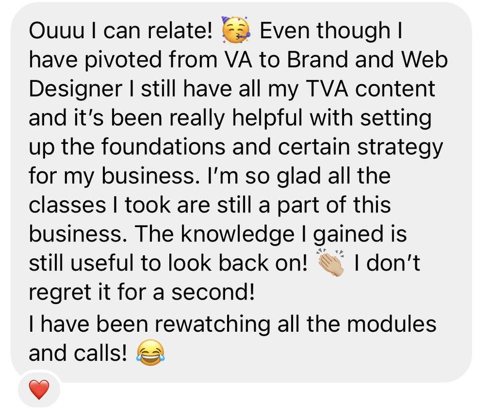 My girls send me their packages, content for editing, pricing for feedback, canva guides, worksheets & more! It’s there to provide you HIGH level tailored support even outside of our 1:1 time calls every step of the way!