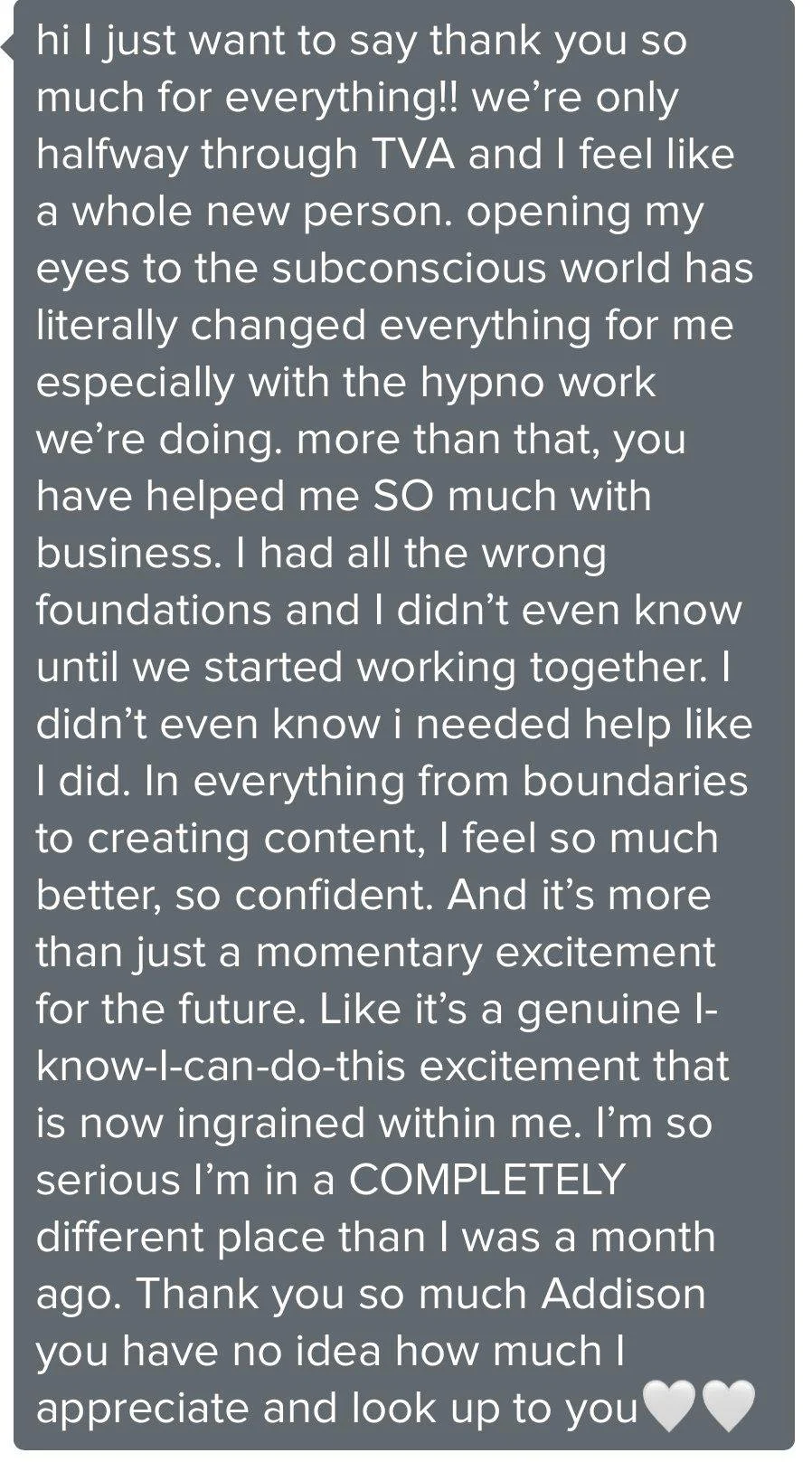 Chock full of hypnosis audios and additional trainings (see below) and usually added to during your time in the program.... you don't need this portal because you get so much access to Addison for personalized support BUT it is nice to have to boost your business strategy and get clearer on the subconscious sales framework.