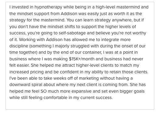 It’s a 3-month immersive group experience with weekly coaching + live hypnotherapy calls, direct access to Addison, and intimate support inside a private chat with other women who are actively reprogramming alongside you. This is not passive. It’s deep work, in real-time, inside a powerful container designed for identity-level transformation and momentum in your business and life.