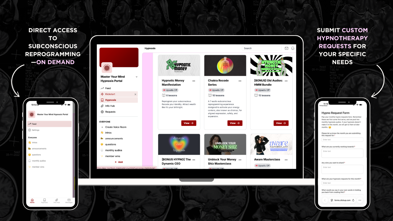 Members submit a request form sharing what they're working through — money, visibility, confidence, relationships, and more. I create two custom hypnosis audios per month based on these submissions. Spots are first come, first serve.